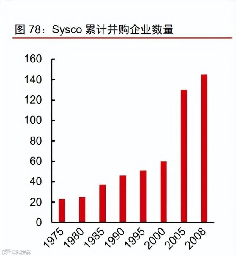 上下游高标准化催生餐饮供应链企业,Sysco 通过多次并购进行行业整合。随着下游 连锁餐饮企业往全国扩张,建立标准化供应链的需求愈发强烈。