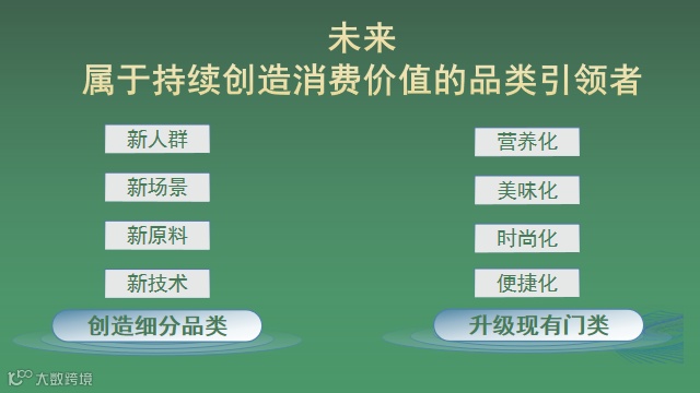 另外一方面,通过营养化、美味化、时尚化、便捷化,技术的进步,把现在的门类重做一遍,向品质更高,口感更好,成本更低持续迈进。