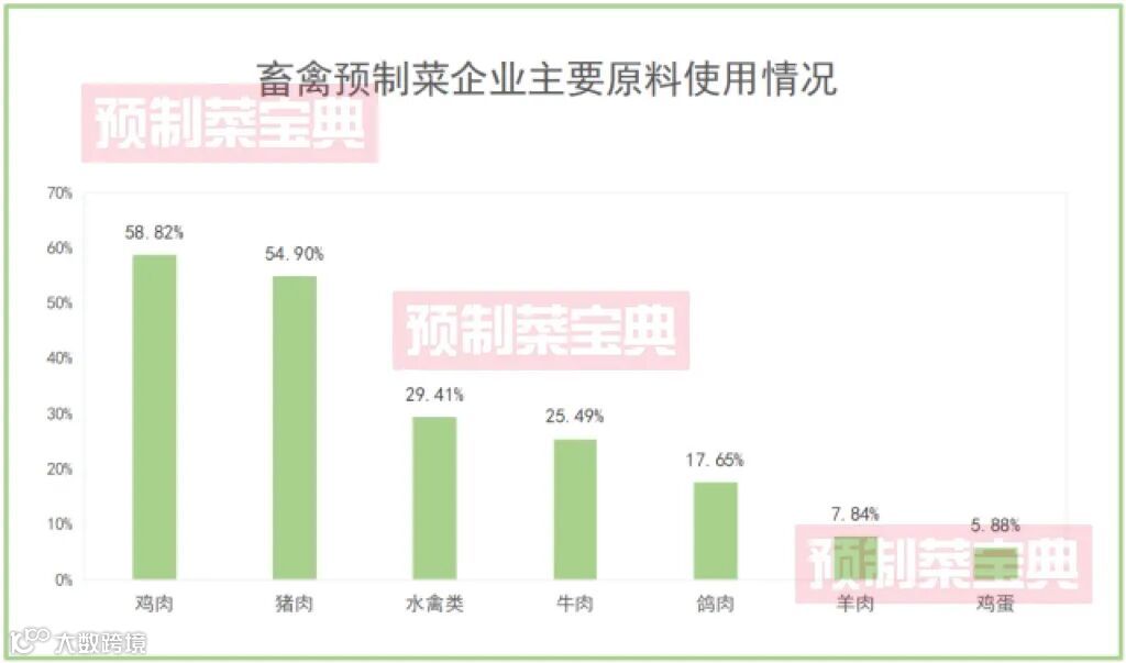 值得注意的是,当前企业开发鸡肉类预制菜产品偏爱盐焗鸡,猪肉类预制菜产品则以腊味为代表产品。除了鸡肉和猪肉,企业使用的原料还包括水禽类、牛肉、鸽肉、羊肉和鸡蛋等。