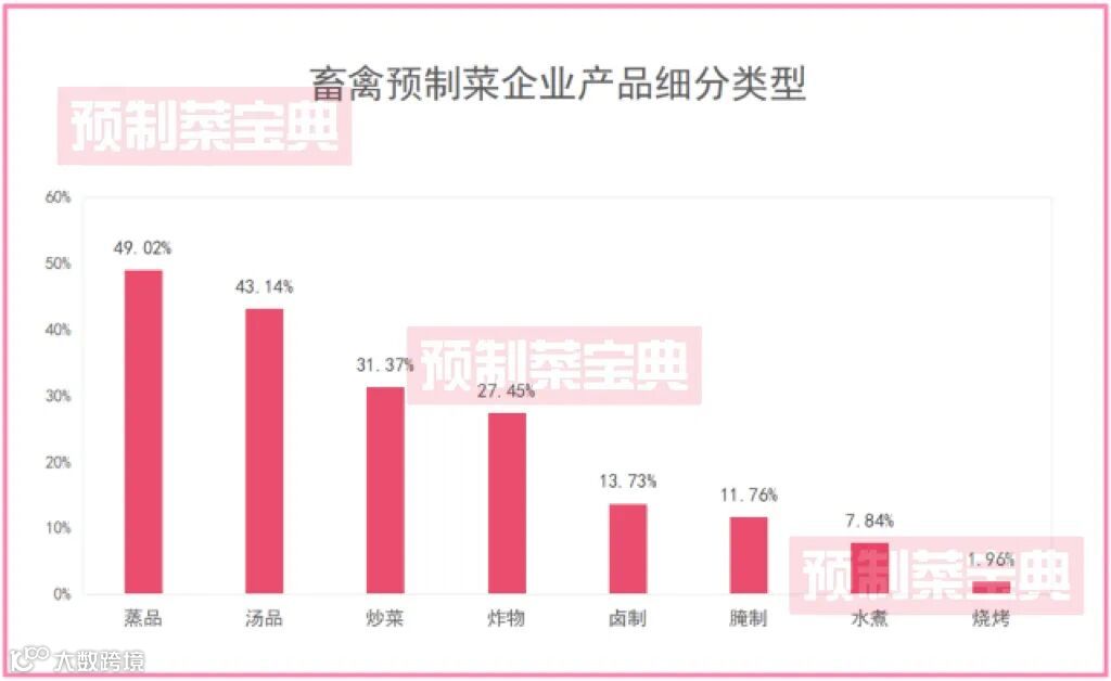 其中,蒸品类别畜禽预制菜产品数量最多,近半企业开发相关预制菜产品;汤品次之,约43.14%的企业选择开发畜禽预制菜汤品类产品。