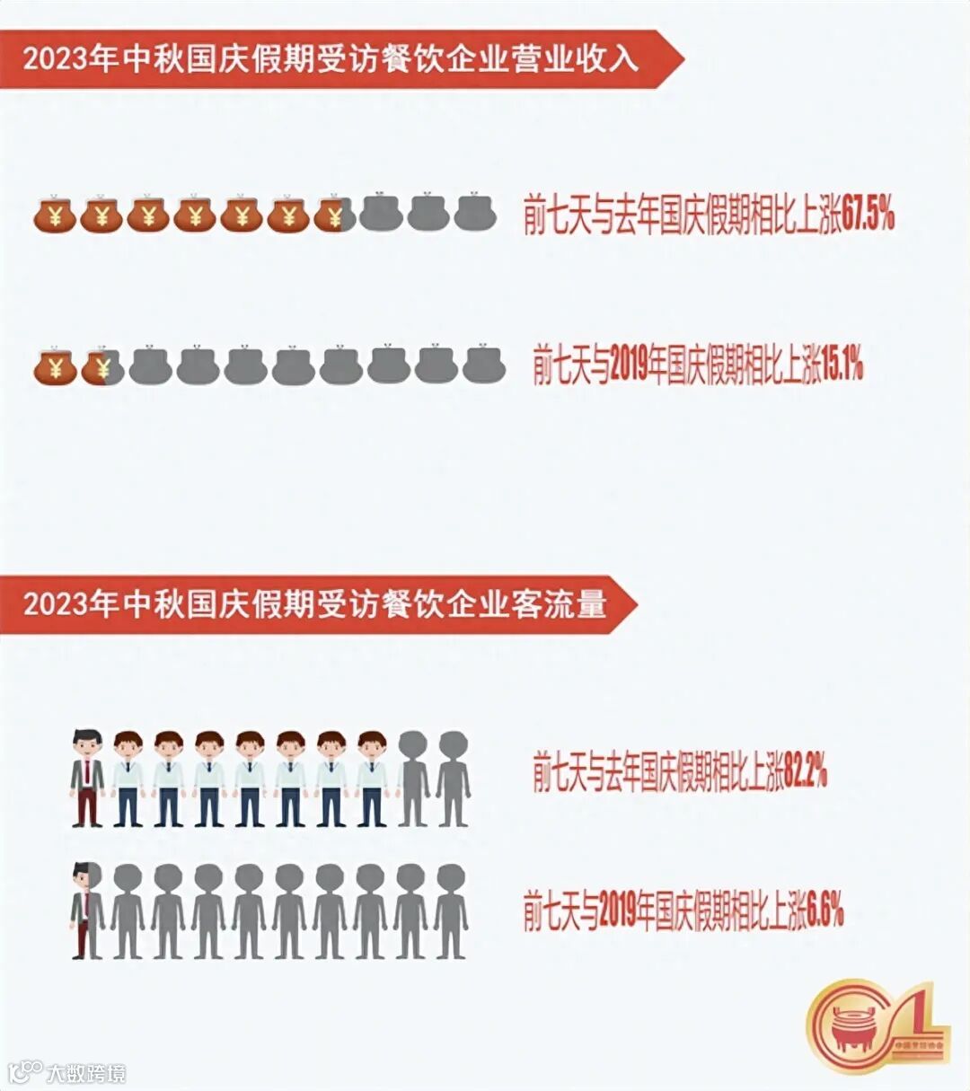 据中国烹饪协会开展的“2023年中秋国庆假期餐饮业经营情况调研”数据显示,受访餐饮企业假期前七天营业收入与去年国庆假期相比上涨67.5%,与2019年国庆假期相比上涨15.1%;客流量与去年国庆相比上涨82.2%,与2019年国庆假期相比上涨6.6%。