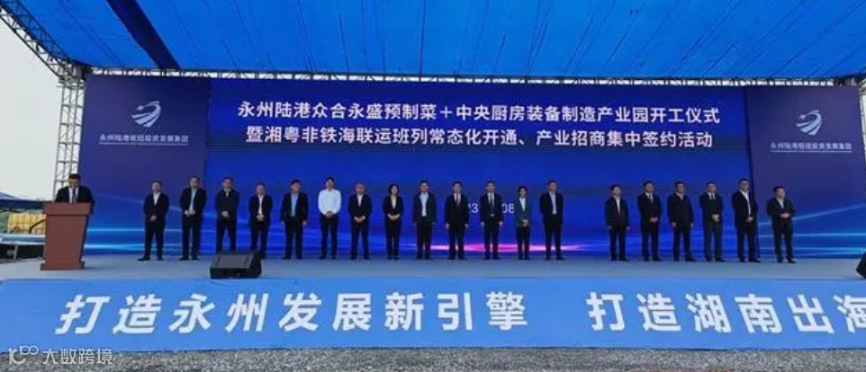 5月8日上午,永州陆港众合永盛预制菜+中央厨房装备制造产业园开工仪式暨湘粤非铁海联运班列常态化开通、产业招商集中签约活动举行。