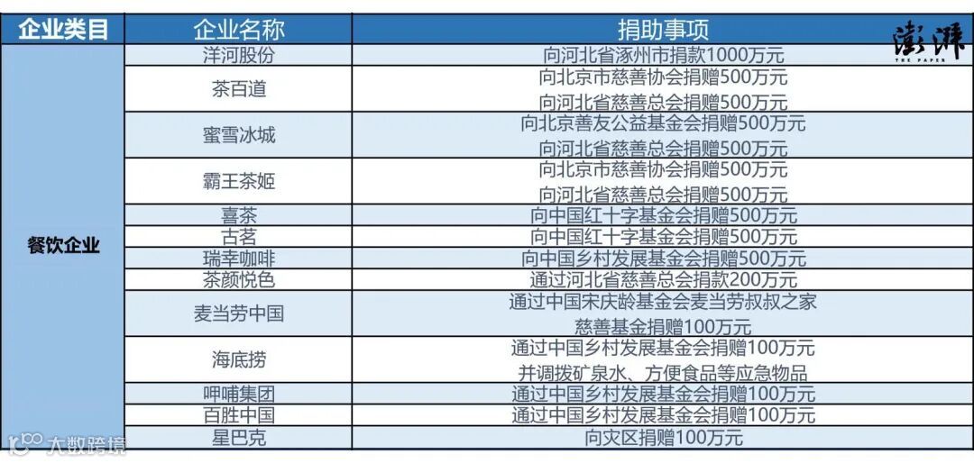 8月3日,海底捞通过中国乡村发展基金会向京津冀等灾情严重地区捐赠100万元人民币。并于即日起,将海底捞涿州范阳中路君悦广场店等位区、大厅、包间等设置成临时援助点,免费为周围居民提供庇护场所、餐食等力所能及的帮助。