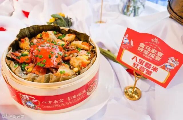 这道菜选用带膏率在15%-20%之间的红膏蟹,将太湖糯米经过鲍汁煨制后加入虾仁、鲍鱼丁、豌豆、瑶柱等8种食材,做成咸鲜口味的八宝糯米饭。用户买回家之后,用附赠的蒸笼上锅隔水加热15分钟,即可解锁一道大餐。