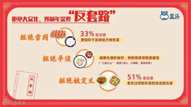 “虽然放开了,大家选择更多,但预制菜依然会在年夜饭餐桌上稳占C位。”盒马3R商品中心总经理田鑫说,围绕“拒绝雷同、拒绝平淡、拒绝被定义”三个消费需求,盒马今年用小众地方特色菜突围“年菜大战”。