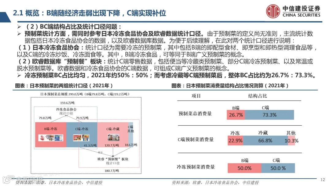 (2)BC端结构占比及统计口径问题:预制菜统计方面,需同时参考日本冷冻食品协会及欧睿数据统计口径。