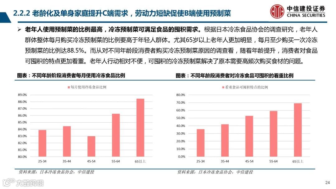 老年人使用预制菜的比例最高,冷冻预制菜可满足食品的囤积需求。