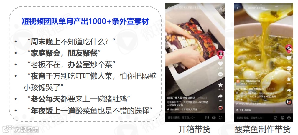 其中,叮叮懒人菜就是吃透抖音算法,以腰尾部+KOC的短视频内容场景化种草,短视频创作围绕“开箱”、“酸菜鱼制作”、“场景话题”搭建起短视频营销矩阵。