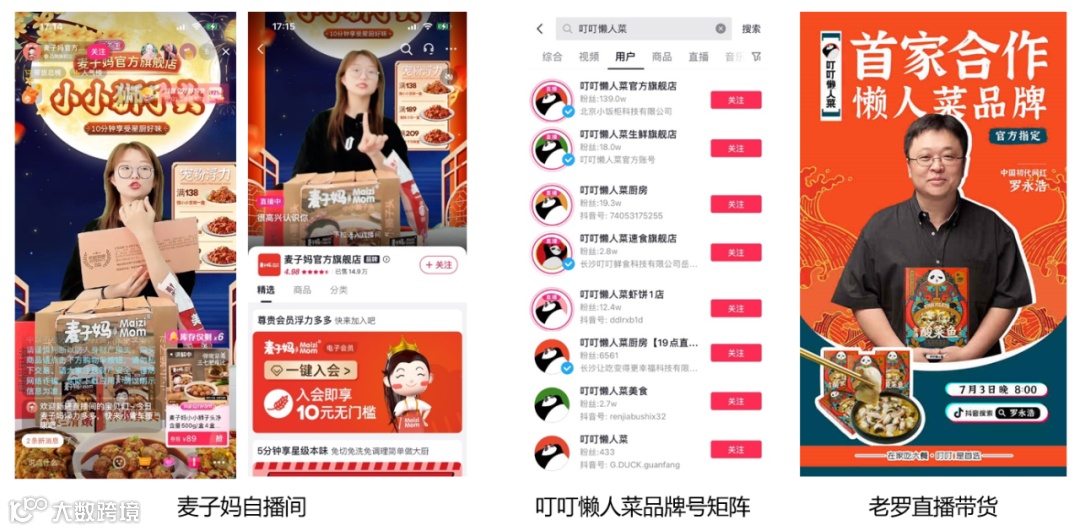 同样,深谙直播带货的叮叮懒人菜,在抖音开设5个品牌矩阵号进行每日24小时不间断直播,上市初期更是联合超头部达人与明星合作直播带货,实现单场直播间破40万的峰值。