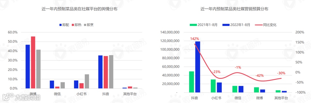 从社媒营销预算分布看,预制菜品牌在抖音平台的预算占比量最大,2022年1-8月同比去年同期,与其他社媒平台相比抖音是唯一正增长平台,且增幅高达140%。