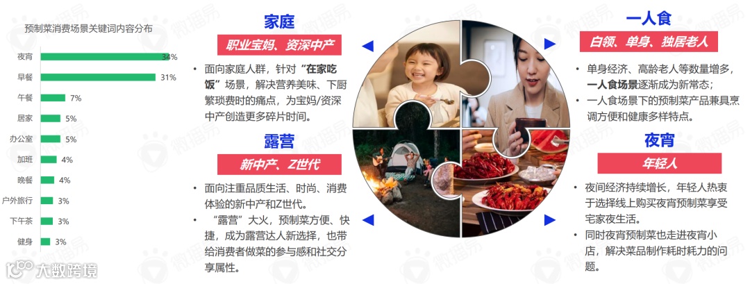 结合当代年轻人的生活节奏,他们在夜宵、早午饭、居家、户外等场景下的讨论兴致更高,因此,“在家做饭”、“一人食”、“露营”、“夜宵”等场景是预制菜品牌首要占领的重点场景。将消费人群与消费场景结合,打磨品类爆品也是新兴预制菜品牌的发力方向。