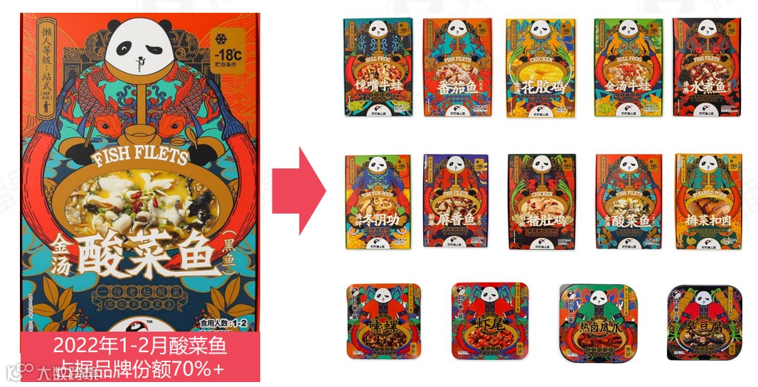 以叮叮懒人菜为例,品牌以宝妈为重点沟通人群,贴合消费者在家做饭场景,从为餐桌加一道大菜为创意原点进行爆品聚焦,洞察到酸菜鱼大单品的消费接受度和普适性,快速打造爆品,切入预制菜市场,并通过产品研发、新品开发和产品的视觉包装等能力提升单品规模,延展产品矩阵。