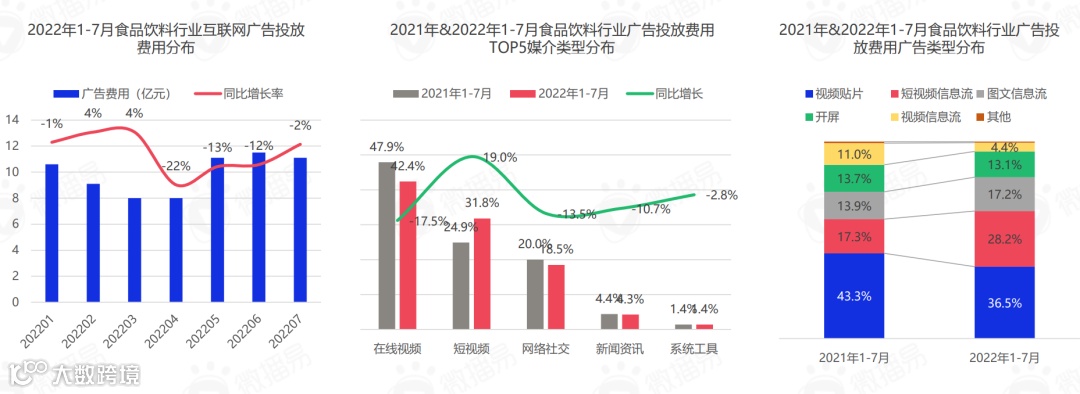对比近两年食品饮料行业广告投放费用在广告类型上的分布,其中视频贴片类广告下降近7%,视频信息流广告上浮10%+,图文信息流广告上浮3%+,短视频、图文等强社交属性的内容愈发贴合消费者的碎片化社交习惯,成为食品行业重要的营销赛道。