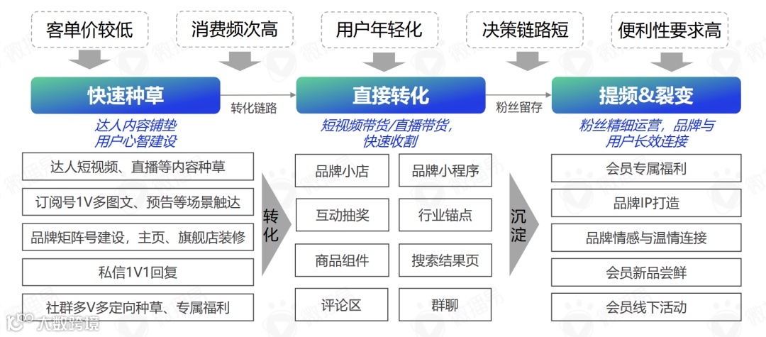 预制菜隶属于食品大行业,其商品客单价较低,满足消费便利性要求,用户消费频次较高,决策链路短。因此,预制菜品牌在社交媒体平台的私域运营策略我们总结为:快速种草-直接转化-提频&裂变。