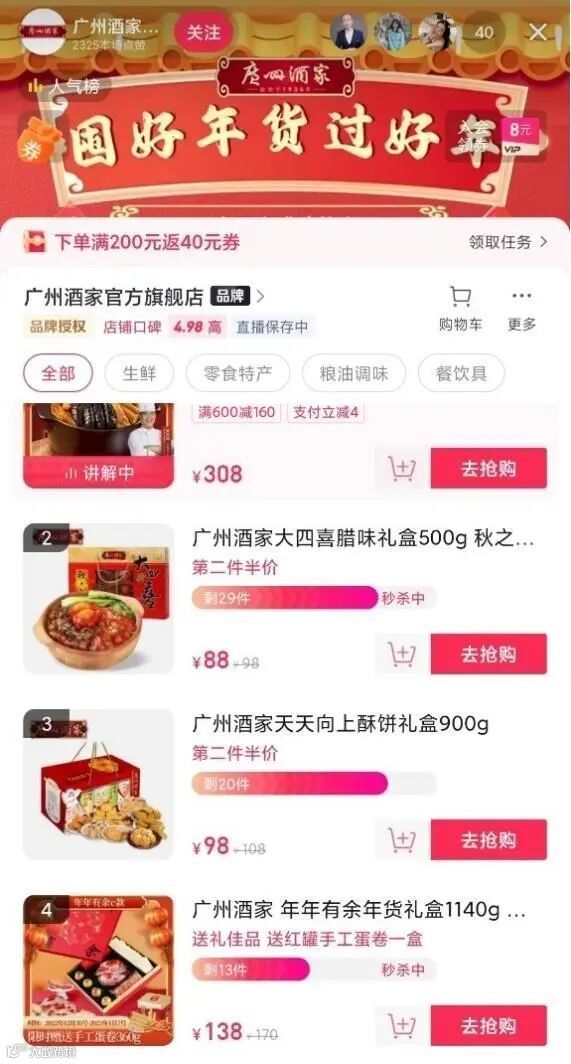 广州酒家直播间内的腊味、酥饼、年货等各色礼盒产品发放优惠福利,价格下降十元或数十元不等。