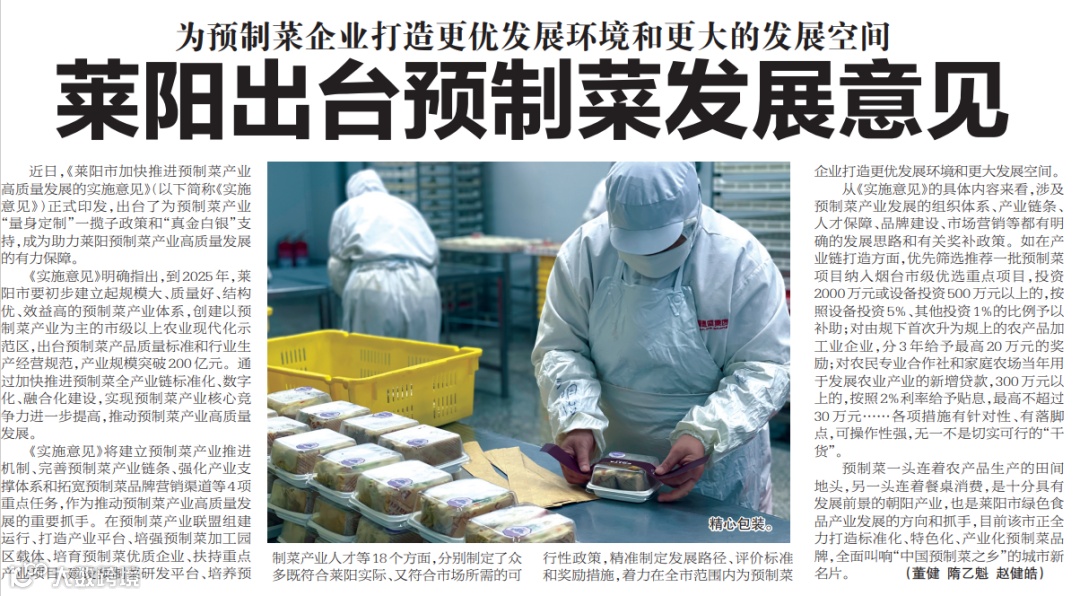 近日,《莱阳市加快推进预制菜产业高质量发展的实施意见》(以下简称《实施意见》)正式印发,出台了为预制菜产业“量身定制”一揽子政策和“真金白银”支持,成为助力莱阳预制菜产业高质量发展的有力保障。