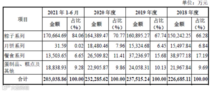 老字号五芳斋核心产业虽包含了连锁门店和食品等,但仅粽子系列产品的零售业绩,从2018年至2021年1-6月收入占比就能达到66.28%、67.74%、70.77%、84.06%。