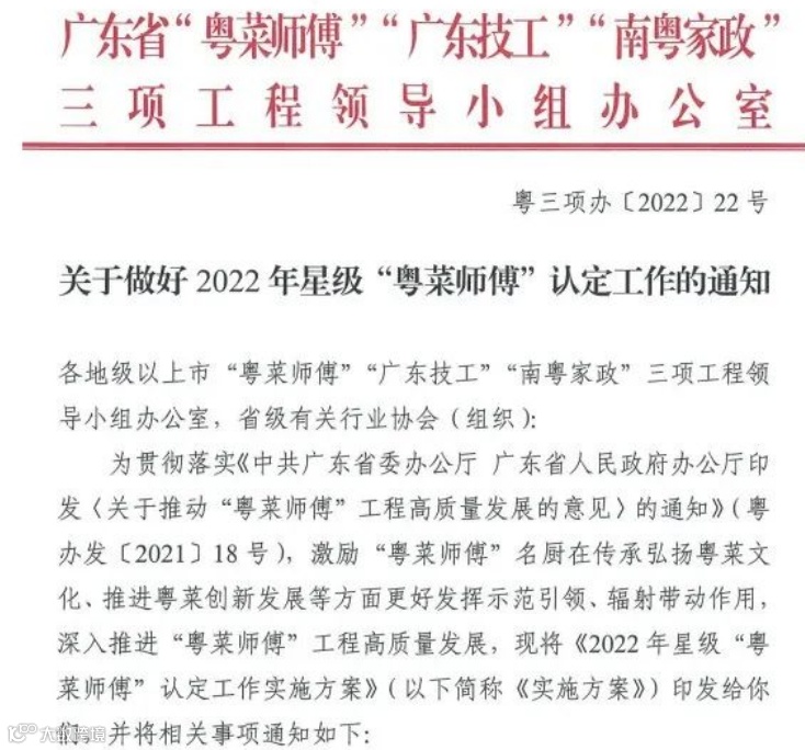 近日,广东省“粤菜师傅”“广东技工”“南粤家政”三项工程领导小组办公室印发《关于做好2022年星级“粤菜师傅”认定工作的通知》。通知规定,星级“粤菜师傅”具体分为一星级、二星级、三星级、四星级和五星级5个等级,五星级为最高级别,从2021年起每年认定一次。全省每年认定四星级“粤菜师傅”总数不超过80人,五星级“粤菜师傅”不超过30人。