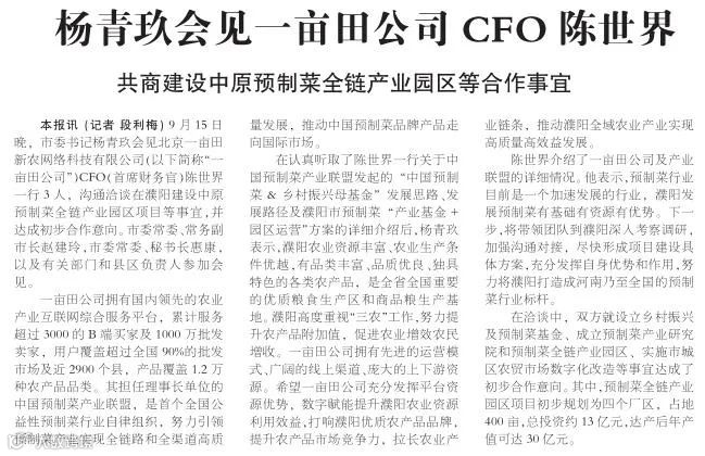 据濮阳日报,9月15日晚,濮阳市委书记杨青玖会见北京一亩田新农网络科技有限公司CFO(首席财务官)陈世界一行3人,沟通洽谈在濮阳建设中原预制菜全链产业园区项目等事宜,并达成初步合作意向。