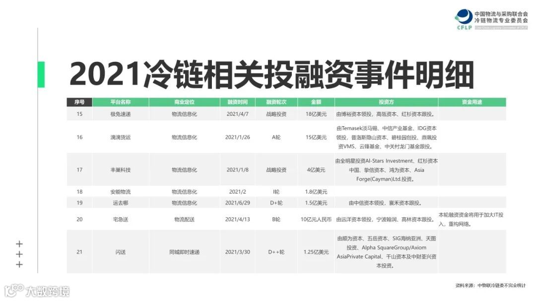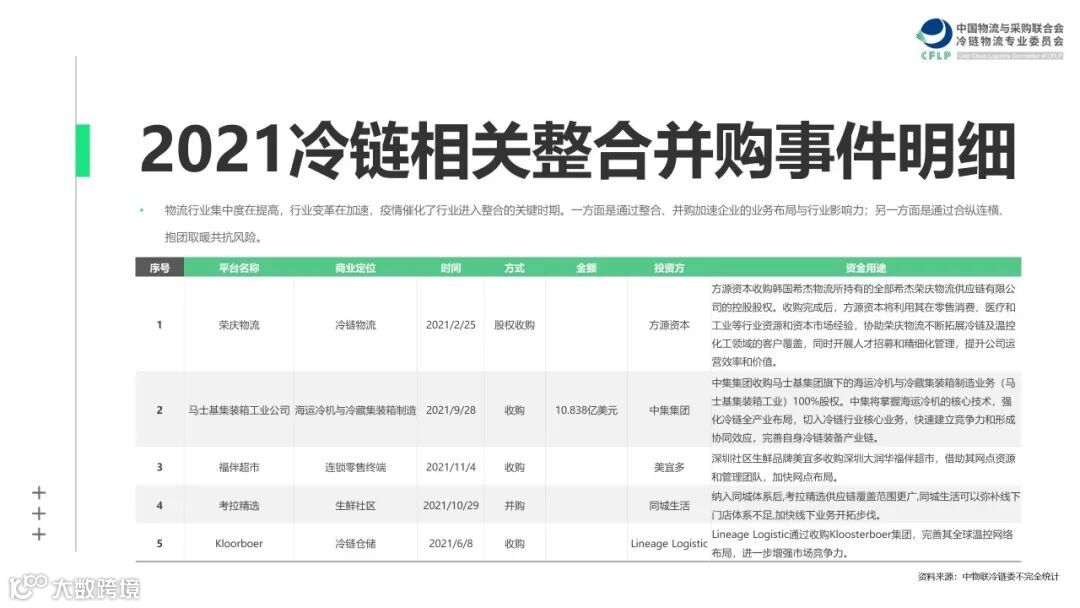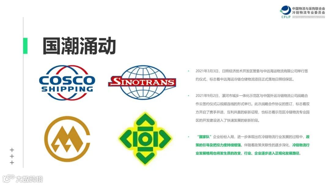 风云难测的2021年,在无数冷链人的不懈努力下,为冷链行业的发展交出了一份令人满意的答卷。为能够更好的梳理出2021年冷链物流企业发展的核心脉络,我们特整理了全年企业大事件,并围绕“新能源”、“新风口”、“新速食”、“新跨境”、“新国潮”五大热点方向,为大家展示2021年冷链物流企业经营及发展特点。