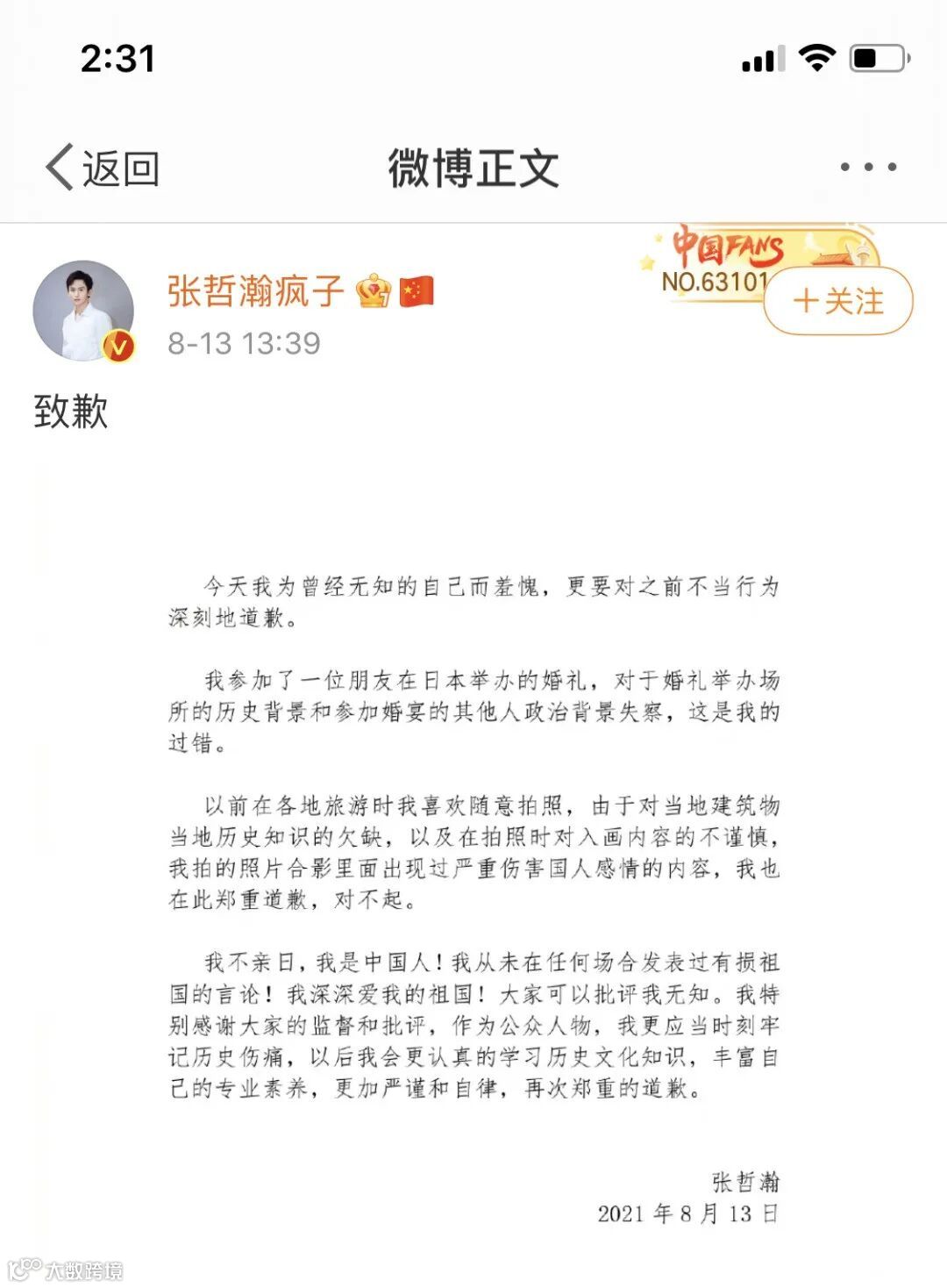 张哲瀚“亲日风波”事件以来,仅一天的