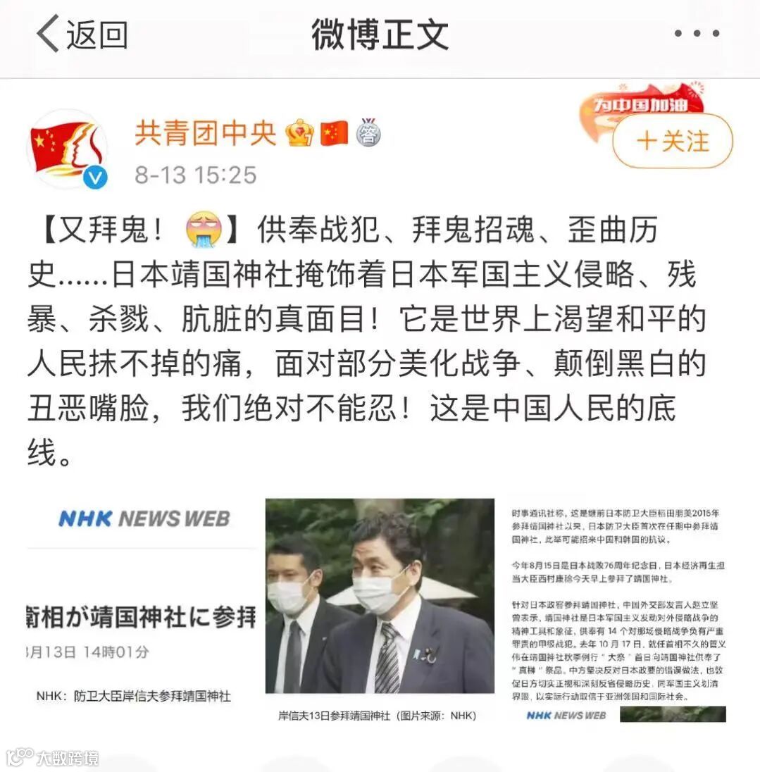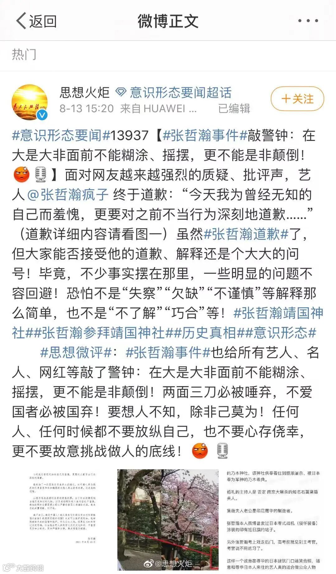 无数先烈的牺牲才换来了如今的太平盛世,张哲瀚究竟是无知,还是故意为之?在日本供奉战犯的神社内大肆自拍发文,是连基本的常识都不具备吗?