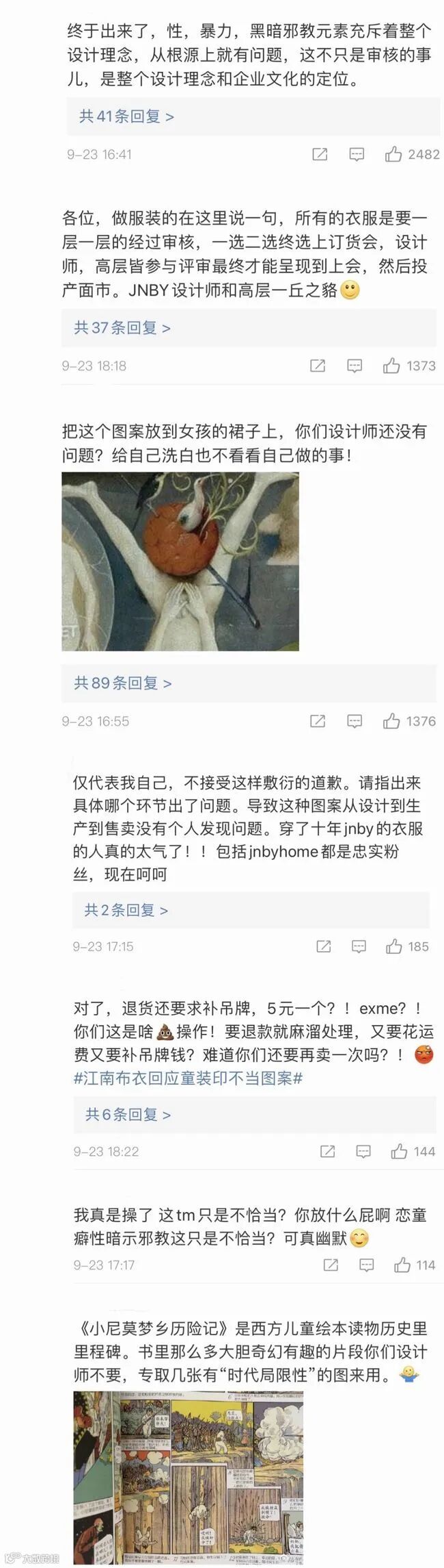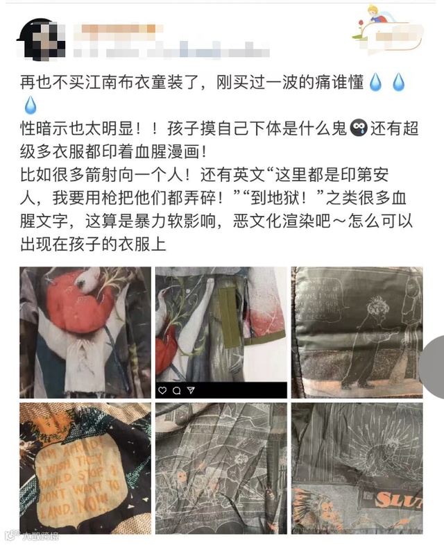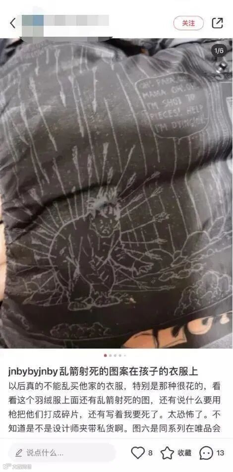 随后陆陆续续有更多网友晒出衣服图片:“破烂的兔子”、“插满箭的小人”、“胸前怪手”、“女性下体”等怪异图案,不禁让众多消费者直呼简直