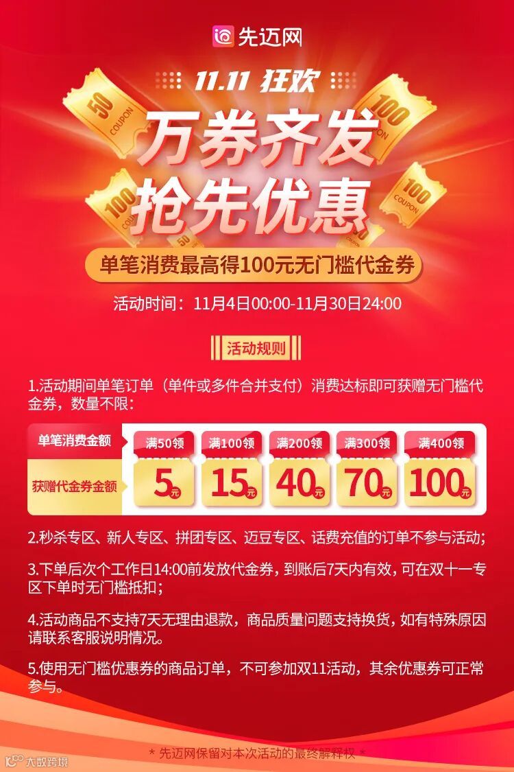 记得来先迈商城领代金券哦