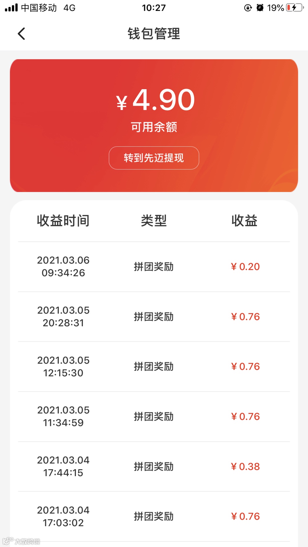 店主开团奖励在拼团成功后实时到账,可在先迈网APP个人中心店主钱包中查看,并支持转到先迈提现。