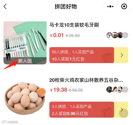 参与新人团,拼中者可获得商品+迈豆奖励;