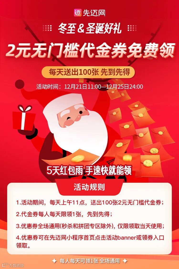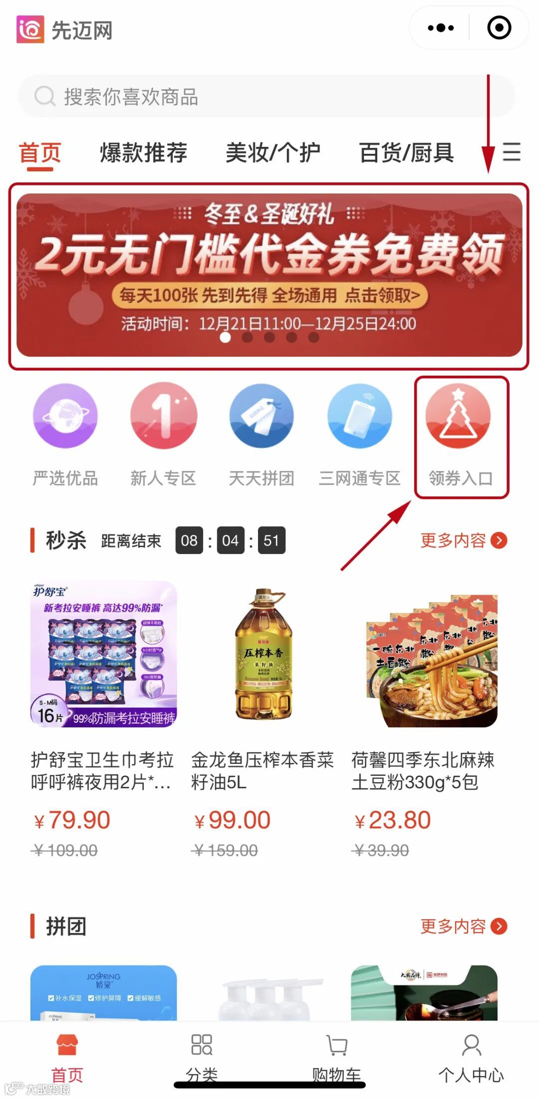 领取方式二:打开先迈网小程序首页,点击领券入口领券;