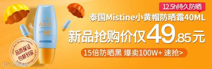 今天推荐的这款泰国Mistine小黄帽防晒霜,大家应该不陌生,它在防晒圈内的口碑可是杠杠的,不仅轻薄、水润,而且特别温和,不论你是什么肤质,都能使用!