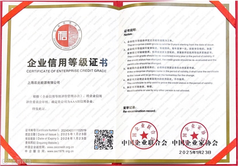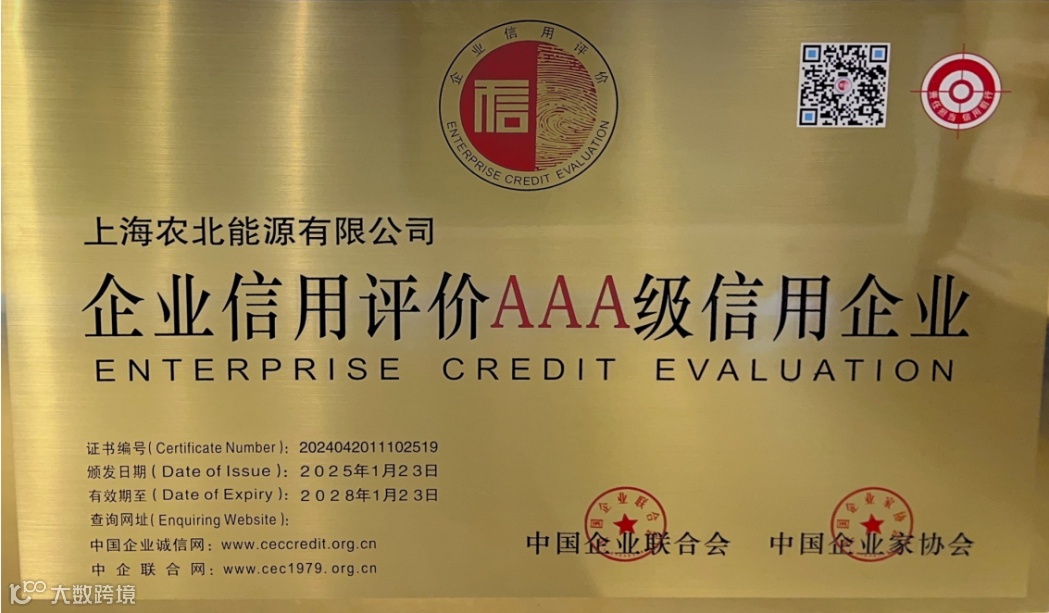 近日,经中国企业联合会、中国企业家协会审核认证,上海农北能源有限公司荣获国家AAA级信用企业称号。这一荣誉不仅是对上海农北长期以来坚守诚信经营理念的肯定,也为未来企业的发展注入了更多信心和动力。