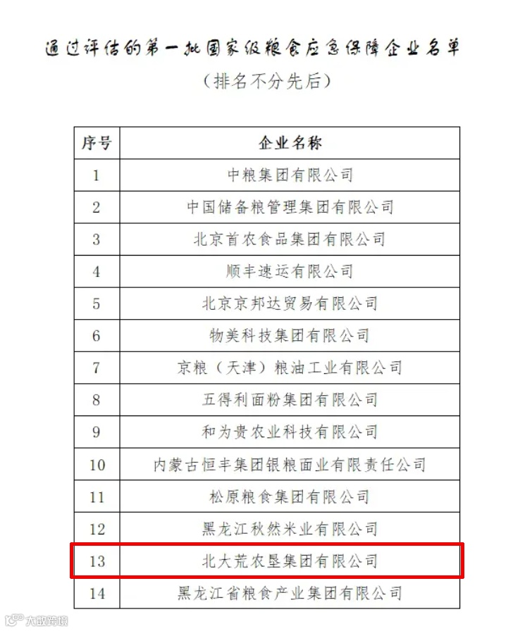 日前,国家粮食和物资储备局发布了通过评估的第一批63家国家级粮食应急保障企业名单,北大荒集团凭借在保障国家粮食安全领域作出的杰出贡献,通过评估入选名单。
