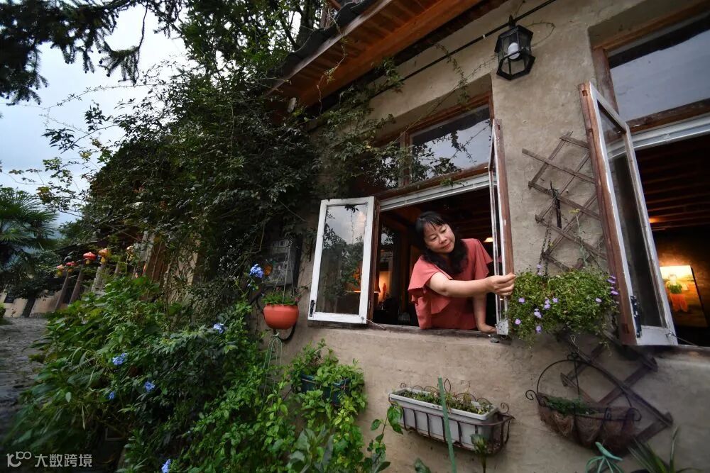 8月29日,在福建省屏南县熙岭乡,龙潭村“新村民”梅宏在打理自己经营的民宿外墙装饰花盆。新华社记者姜克红 摄