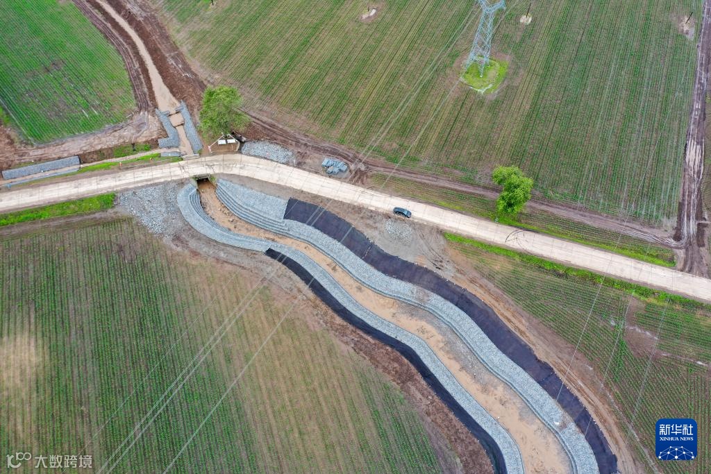 6月23日拍摄的北大荒集团黑龙江友谊农场有限公司侵蚀沟石笼谷坊治理工程现场(无人机照片)。