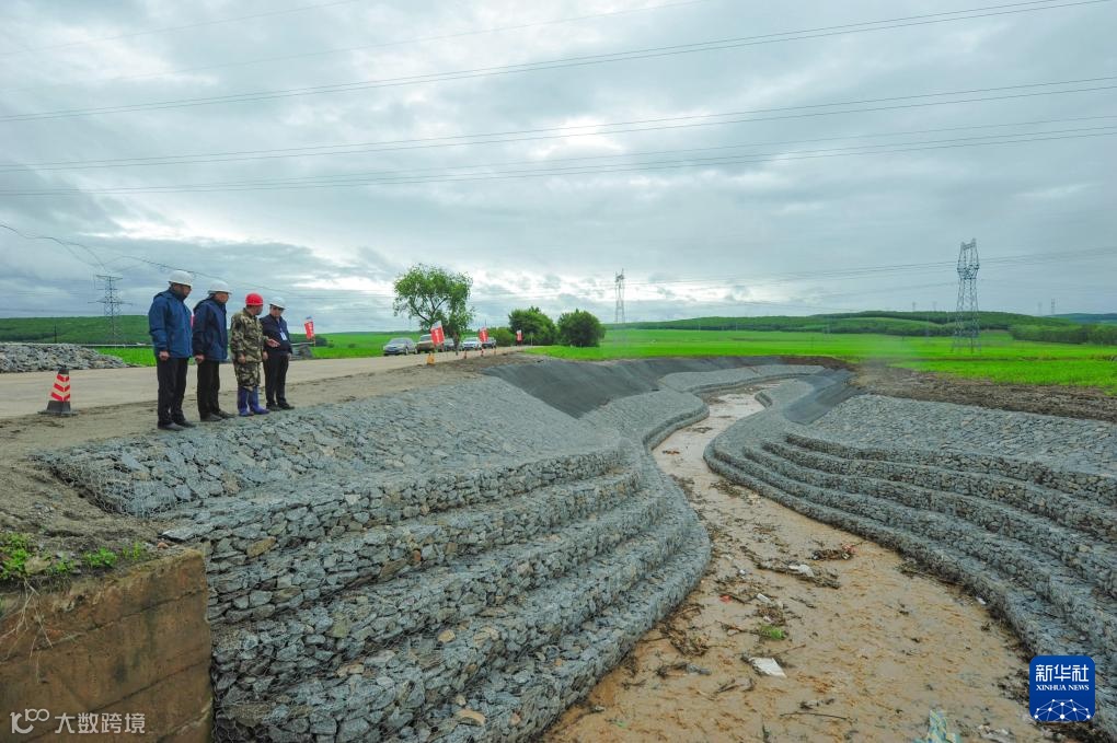 6月23日,在北大荒集团黑龙江友谊农场有限公司侵蚀沟石笼谷坊治理工程现场,技术人员在查验施工效果。