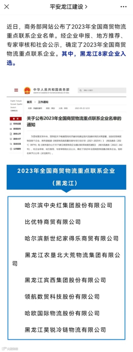 根据党中央、国务院关于畅通国民经济循环和建设现代流通体系的决策部署,为加快培育商贸物流骨干企业,近日,商务部流通业发展司公布了全国商贸物流重点联系企业名单。北大荒物流集团有限公司榜上有名,成为2023年全国商贸物流重点联系企业。
