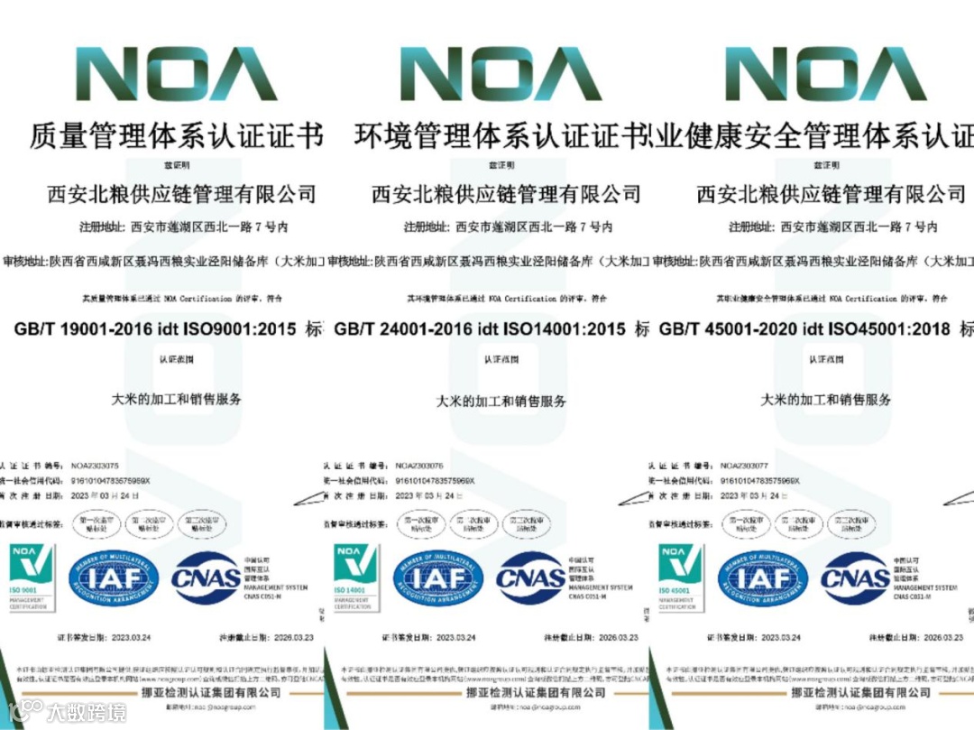 近日,西安北粮供应链管理有限公司顺利通过了ISO三体系认证,获得了ISO9001质量管理体系认证证书、ISO14001环境管理体系认证证书以及ISO45001职业健康安全管理体系认证证书,这是公司在提升企业综合实力过程中取得的新进展,标志着公司在精细化、制度化、规范化管理方面迈上了新台阶。