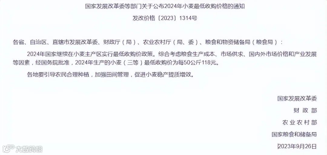 同时,国家发改委等五部门发布《关于2024年小麦最低收购价有关政策的通知》(以下简称《通知》),限定2024年最低收购价小麦收购总量为3700万吨。
