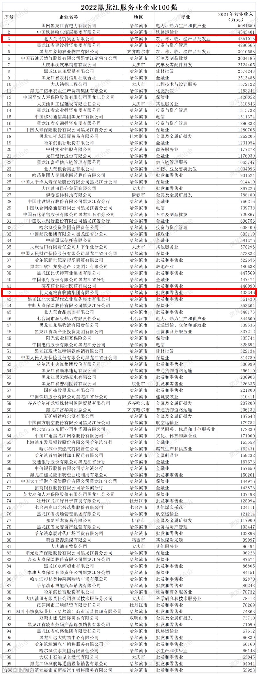 12月5日,黑龙江省企业联合会公布了2022黑龙江企业100强名单,北大荒商贸(收储)集团成功入围2022年黑龙江服务业企业100强,其中,北大荒商贸集团有限公司以4351015万元的营业收入位列第3,北大荒粮食收储集团有限公司以433346万元的营业收入位列第42,目前已进入公示期,最终名次以黑龙江省企业联合会官方公布为准。