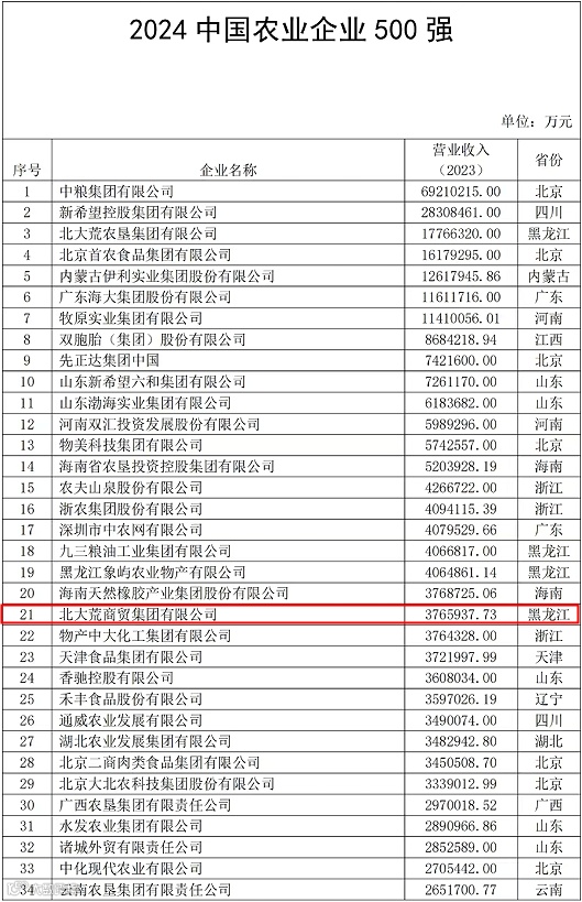 据悉,中国农业企业500强评价活动由农民日报社发起,旨在全面、客观、系统展现我国农业产业发展情况,营造农业企业参与乡村振兴和建设农业强国的良好社会氛围。此次榜单经信息汇集、严格审查、专家评议等程序,参照利润和企业信誉等数据,依据2023年农业企业营业收入排序产生。