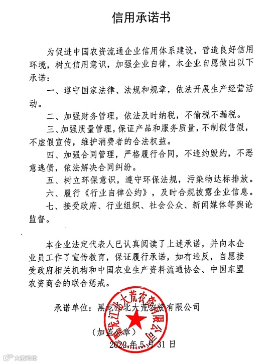 当前,国内疫情防控形势严峻复杂,“三夏”农业生产正全面推开。为深入贯彻党中央、国务院决策部署,加强农资行业质量管理,切实保障国家粮食安全和优质农产品供给,中国农资流通协会发出诚信经营倡议,北大荒商贸(收储)集团农资公司作为行业自律典范签署了企业信用承诺书。