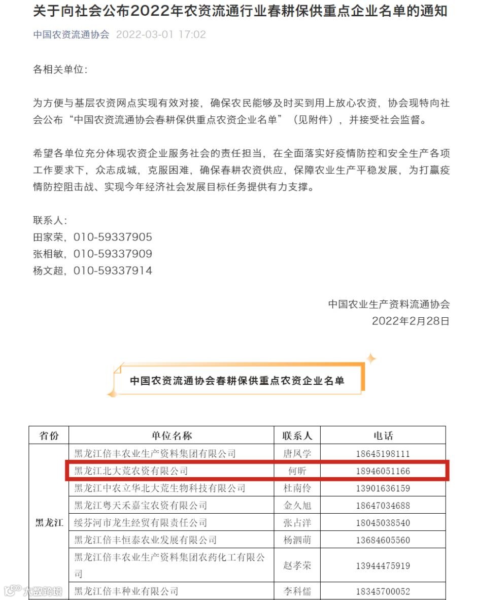 为方便与基层农资网点实现有效对接,确保农民能够及时买到用上放心农资,2月28日,中国农资流通协会向社会公布春耕保供重点农资企业名单,黑龙江北大荒农资有限公司作为农资流通领域规模化供给示范引领带动的典范位列其中。