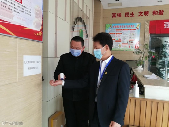 ▲职工在体温测量登记处进行登记、测温