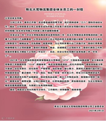北大荒物流集团工会向公司全体女同胞发出了“致北大荒物流集团全体女职工的一封信”,在信中对女职工为公司发展做出的贡献予以肯定,并向女职工送出节日的祝福。