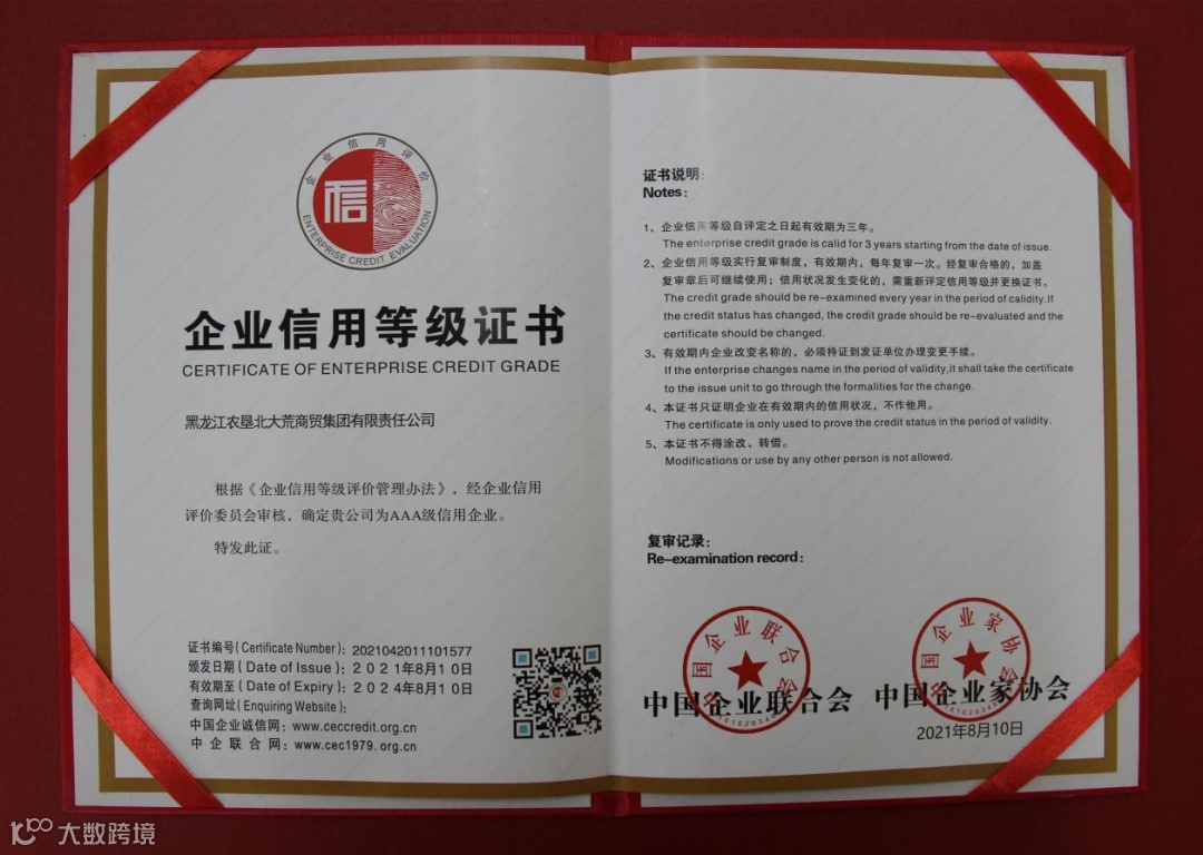 商贸集团此次获得AAA级信用企业共有6家,分别为北大荒商贸集团有限公司、