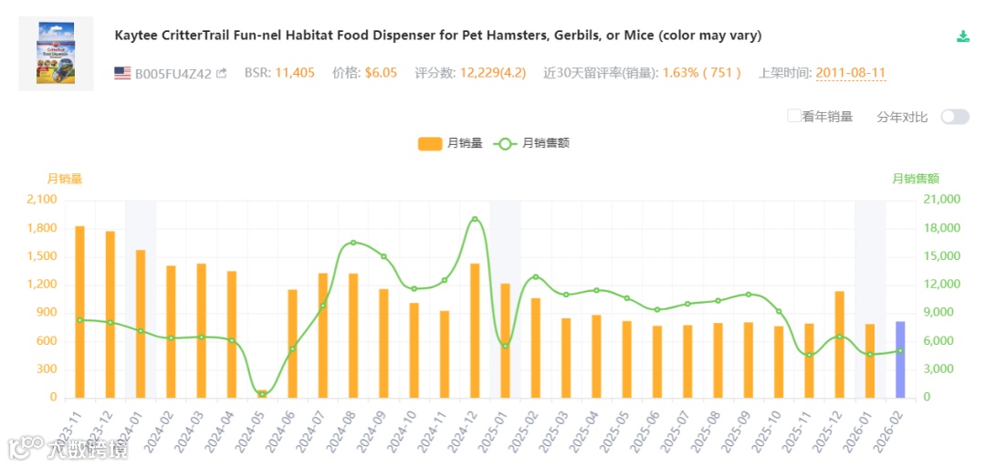 以亚马逊美国站为例,下图所示产品为一种“仓鼠零食分配器”,review:1w+,客单价6.05美金,月销量700+,月销售额4000+美元