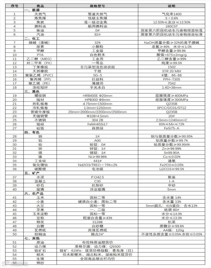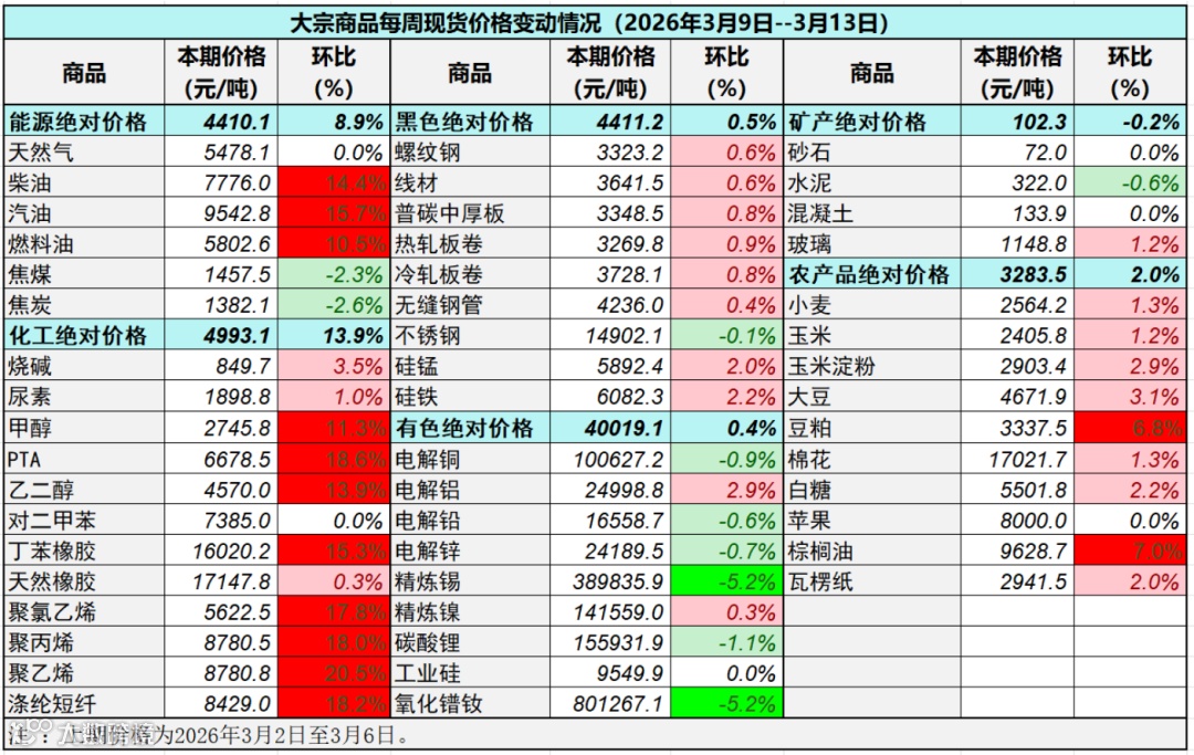 本表所列大宗商品价格为人民币计价的现货价格(含流通费用、利润及税费等),数据来源于国内重点地区生产商、贸易商及下游消费企业的实际成交价、询报盘及可成交价格,单位为元/吨。