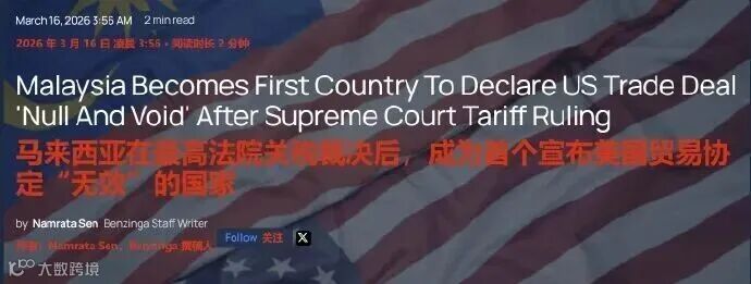 美国最高法院于2月20日裁定,特朗普政府依据《国际紧急经济权力法》加征全球对等关税违宪。随后,马来西亚成为首个公开宣布与美国签署的对等贸易协议失效的国家。